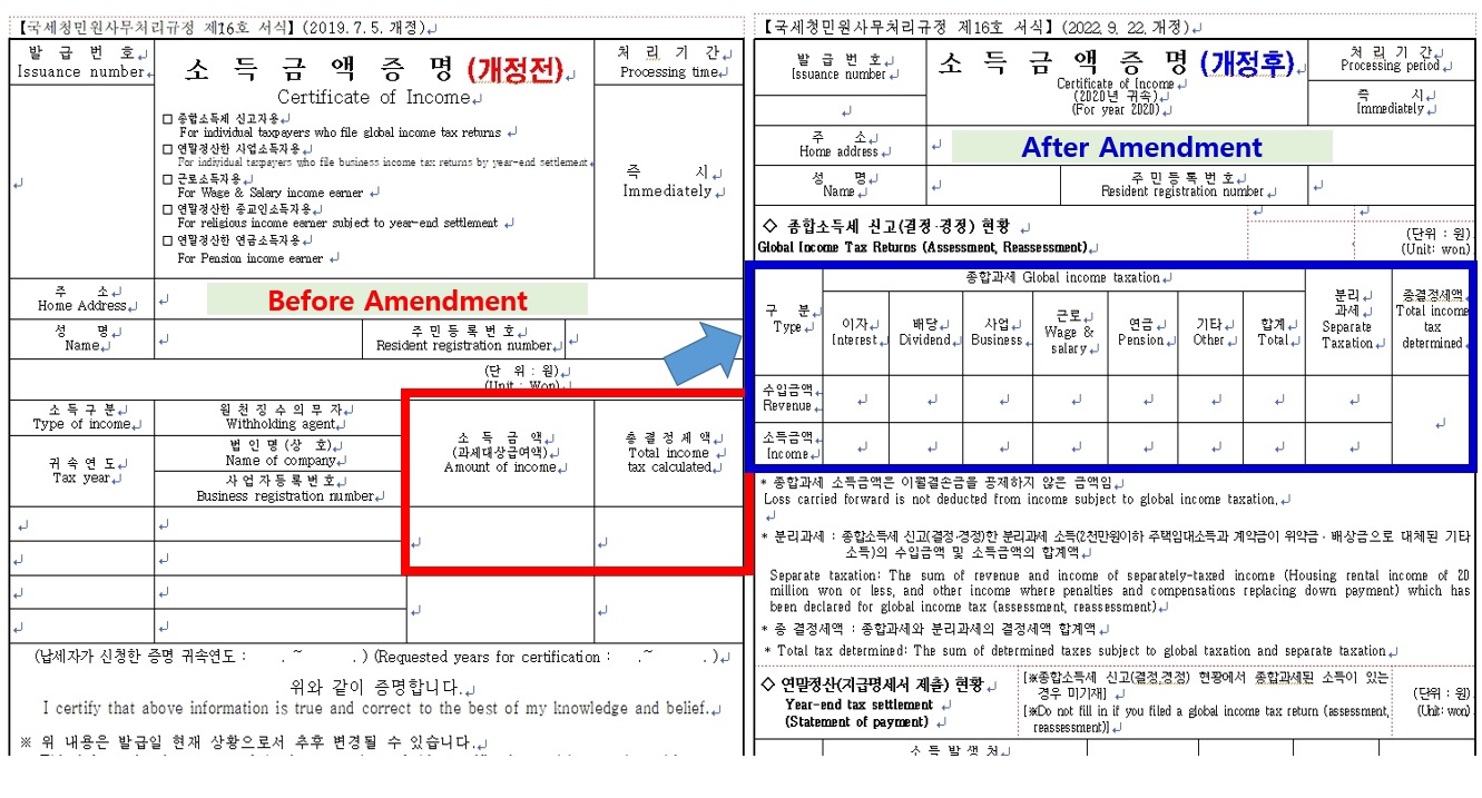 개정된 소득금액증명원은 2022년 9월 22일부터 개정된 서식으로 증명 발급되고 있습니다.